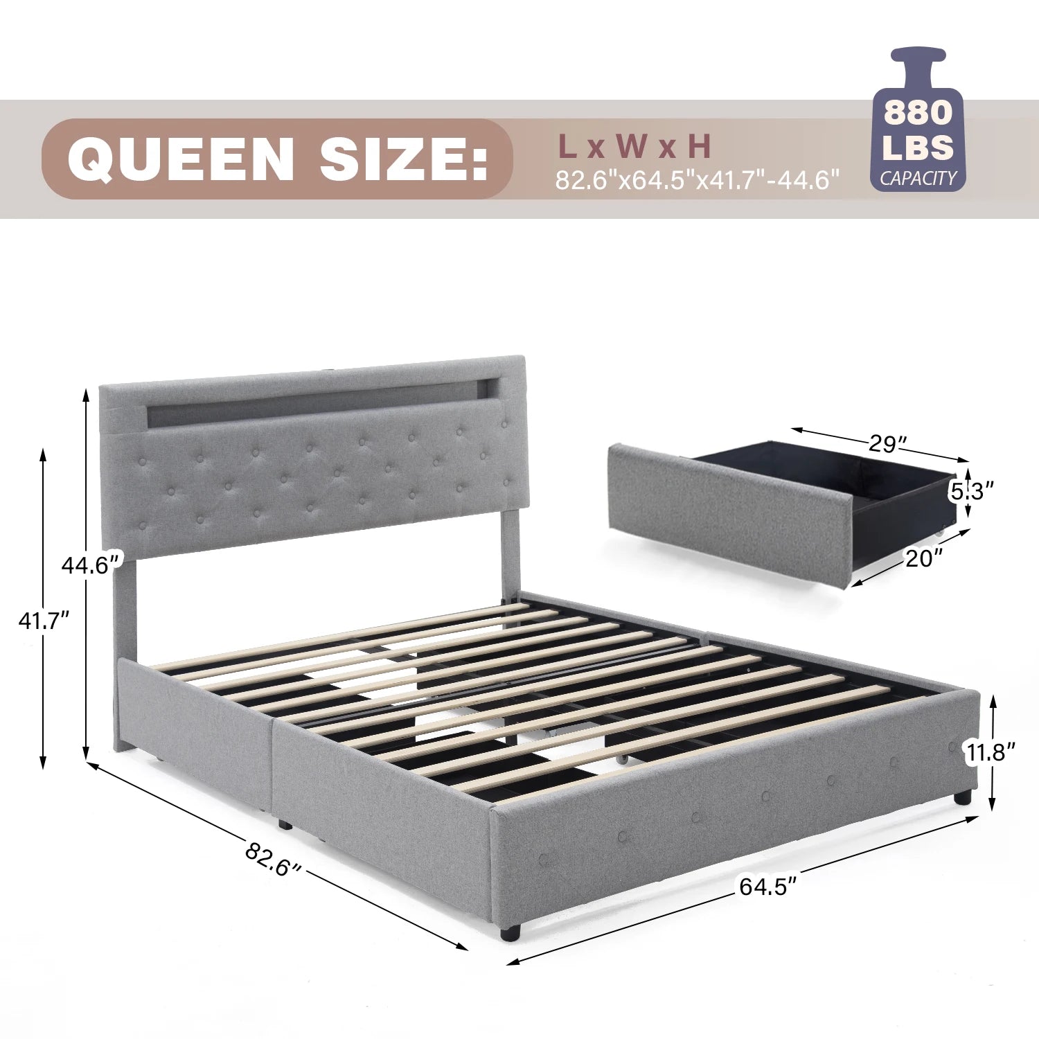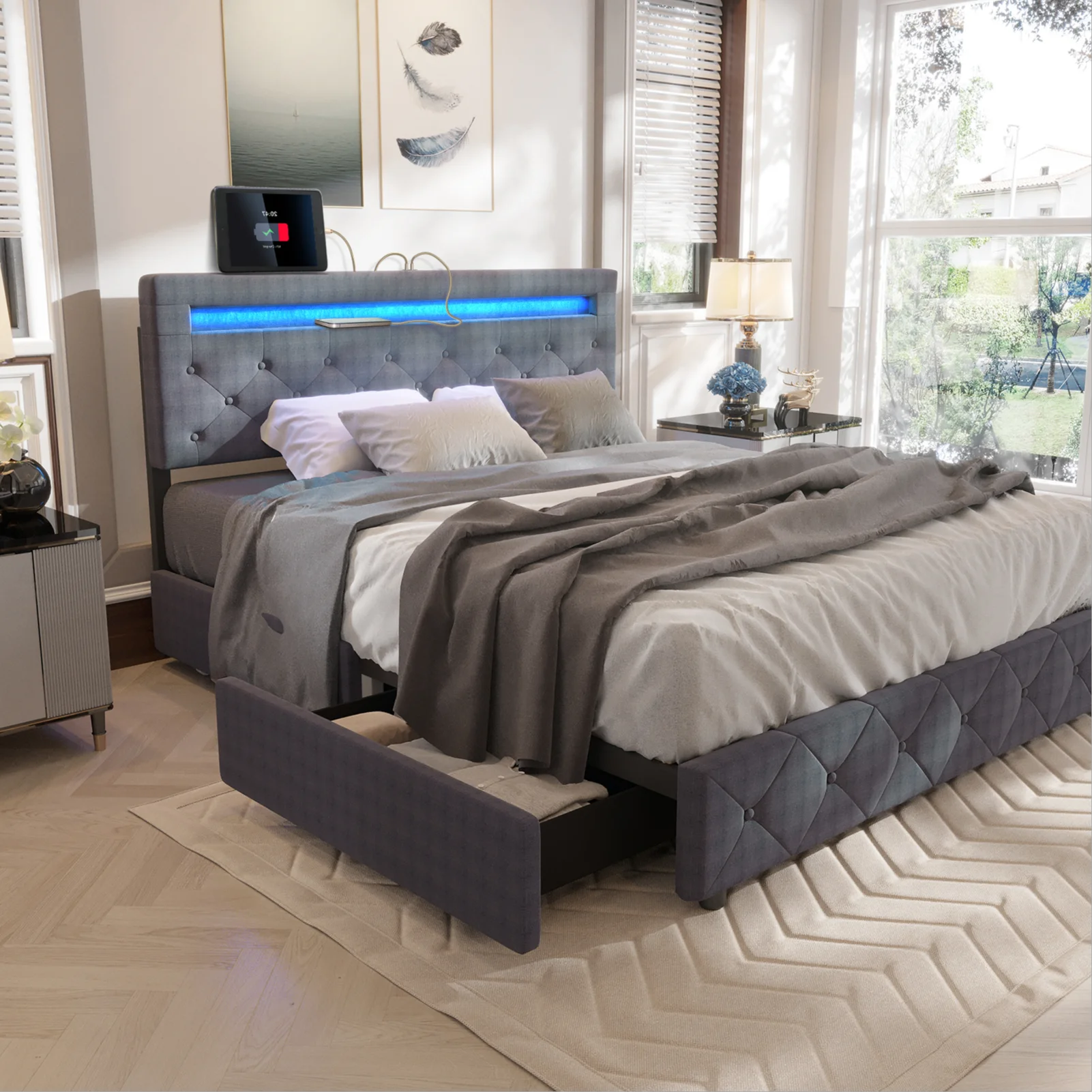 Full/ Queen LED Bed Frame with 4 Storage Drawers and 2 USB Ports, Modern Adjustable Upholstered Button Tufted Headboard Thomas Family Essentials