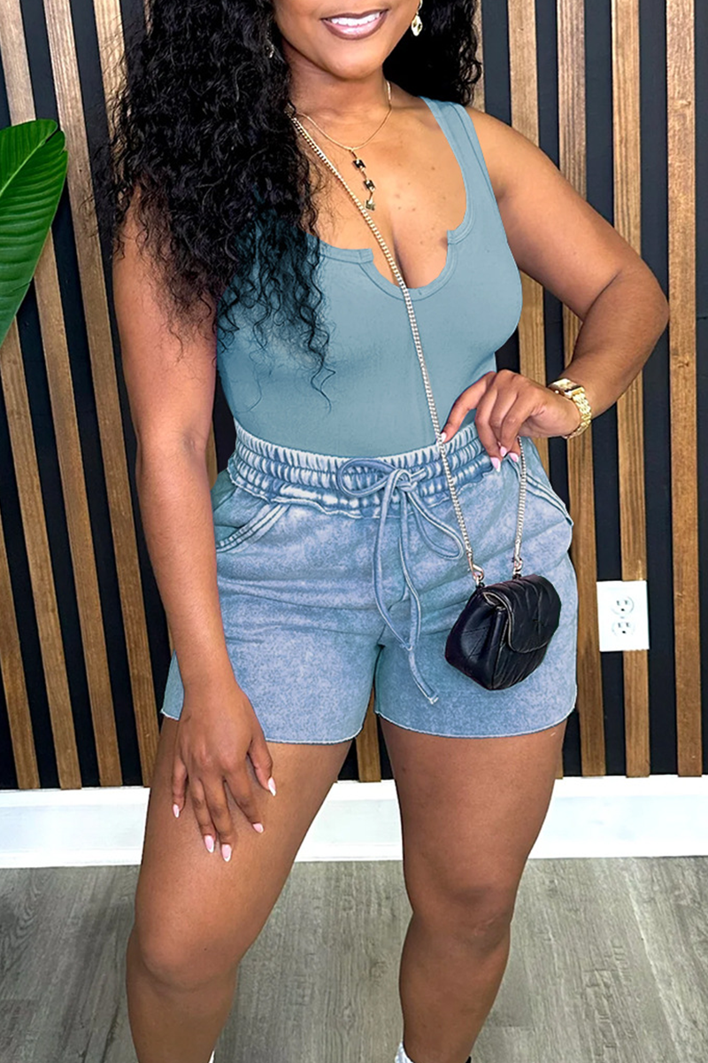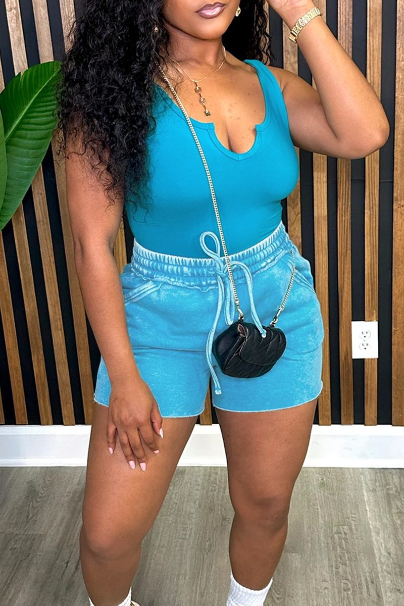 Black Casual Solid Color Draw String V Neck Sleeveless Two Pieces