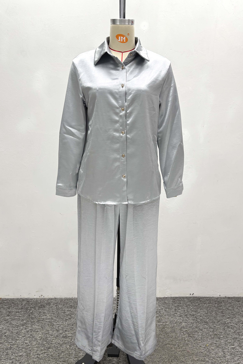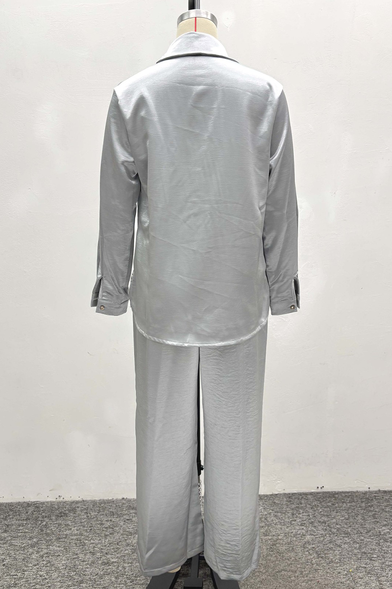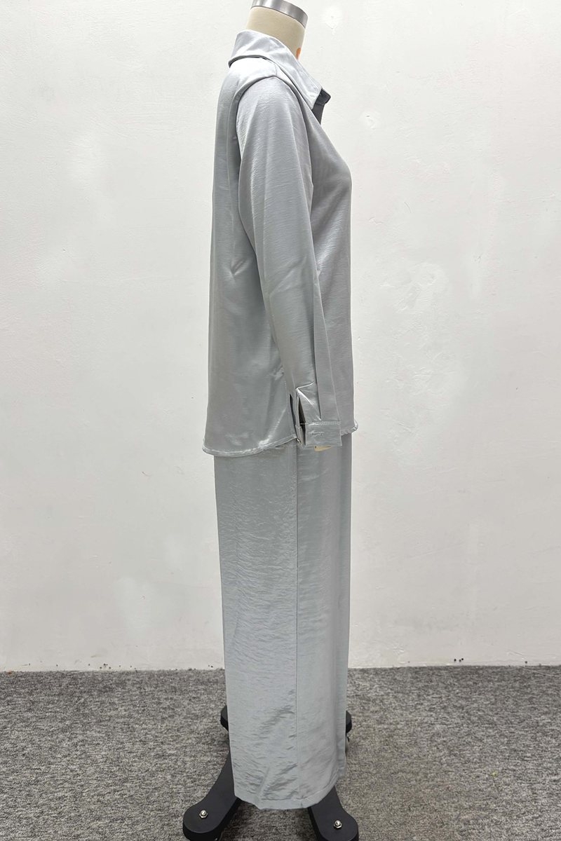Grey Casual Solid Color Buckle Turndown Collar Long Sleeve Two Pieces