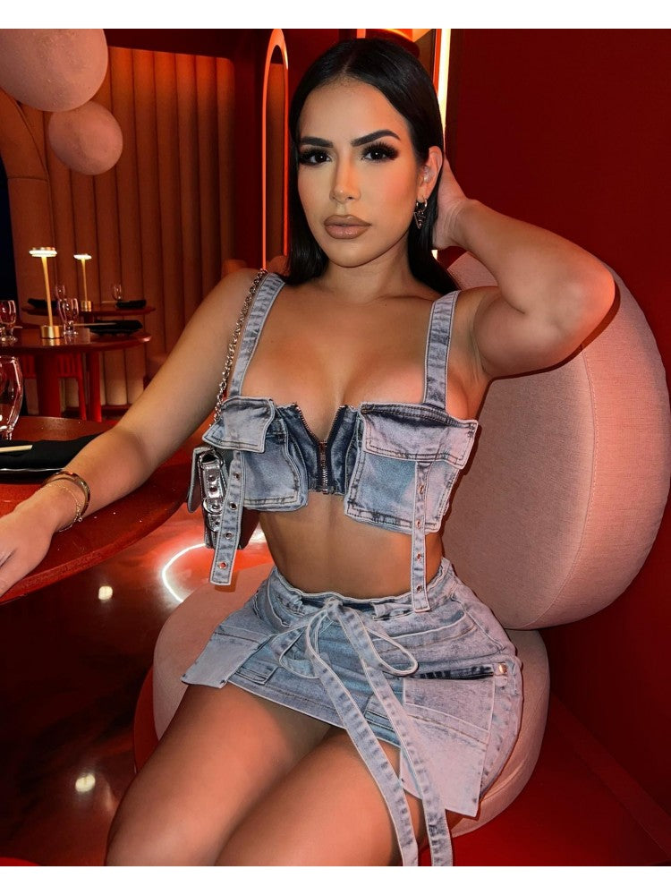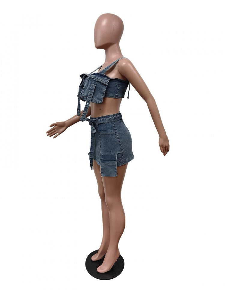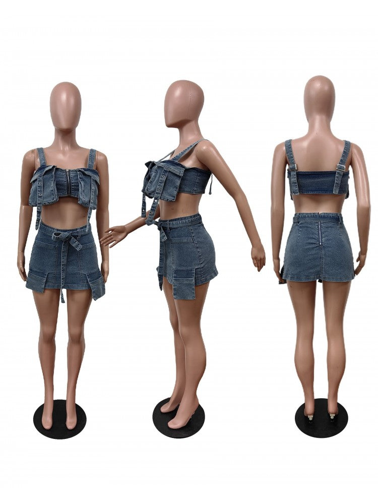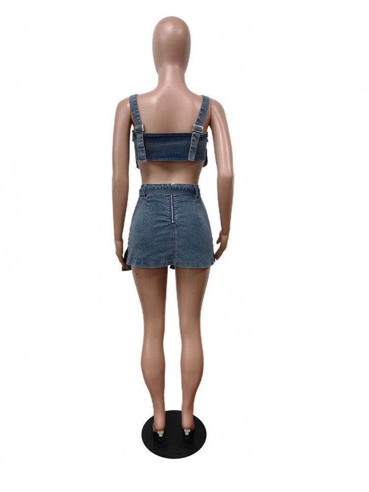 Tie-wrap Cargo Sleeveless Denim Skirt Sets