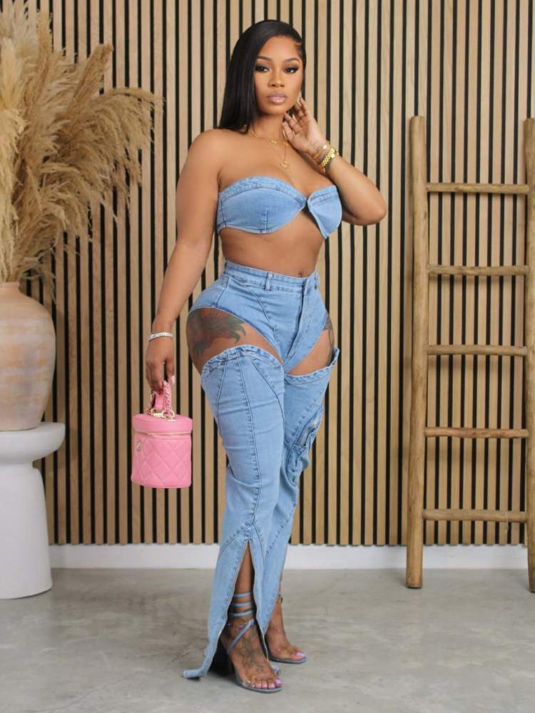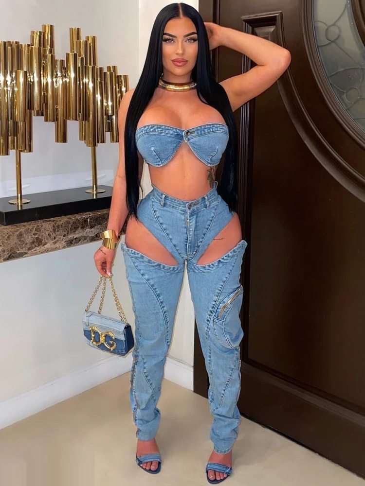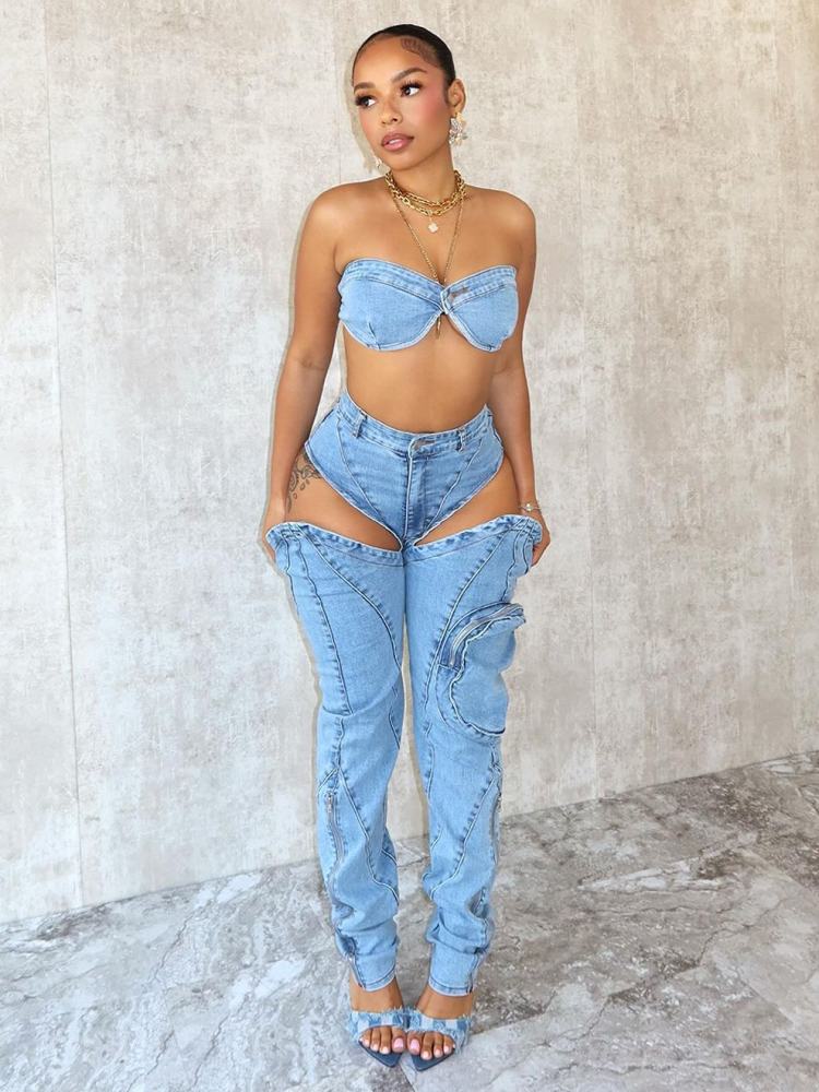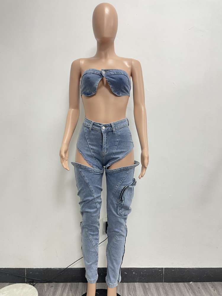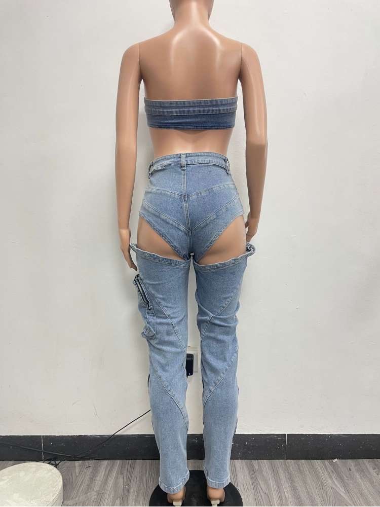 Washed Denim Tube Cutouts Cargo Jeans Sets