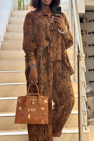 Zebra Casual Zebra Print Buckle Turndown Collar Long Sleeve Two Pieces