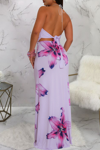 Light Purple Sexy Print Hollow Out Backless Halter Sleeveless Two Pieces