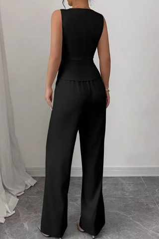 Black Casual Solid Color Buckle V Neck Sleeveless Two Pieces