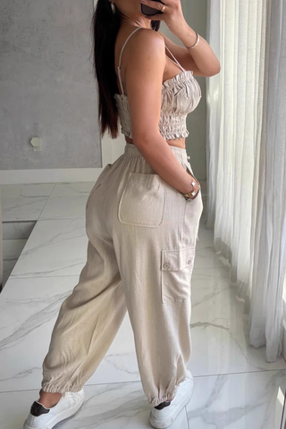 Cream White Sexy Solid Color Draw String Ruched Spaghetti Strap Sleeveless Two Pieces