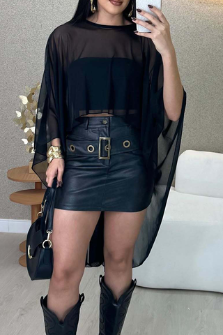 Black Sexy Solid Color See-Through O Neck Three Quarter Two Pieces