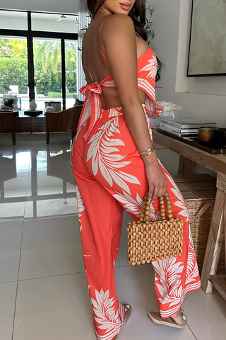 Red Casual Print Backless Spaghetti Strap Sleeveless Two Pieces