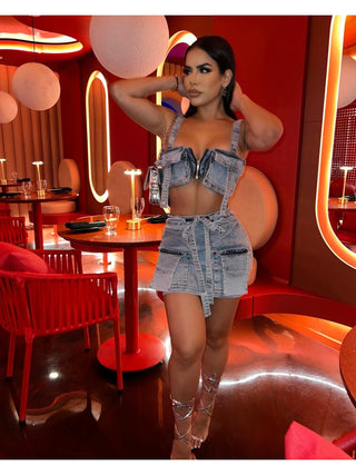 Tie-wrap Cargo Sleeveless Denim Skirt Sets