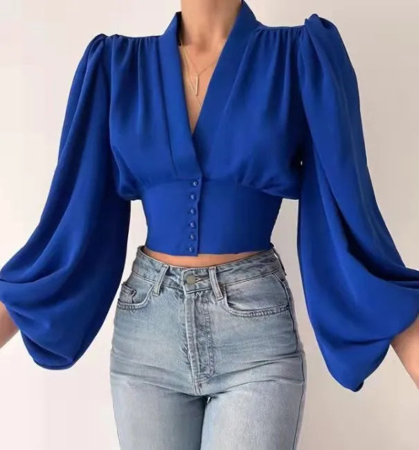 New Ladies Office Blouse Button V-neck Lantern Sleeve Pleated Slim Elegant Plus Size Women's Blouses Shirts