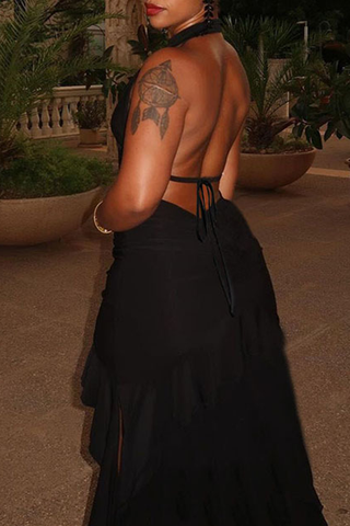 Black Sexy Solid Color Backless High Slit Deep V Neck Long Dresses