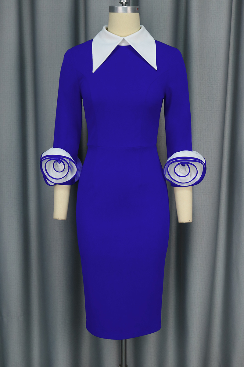 Blue Elegant Solid Color Flower Shape Turndown Collar Wrapped Skirt Dresses