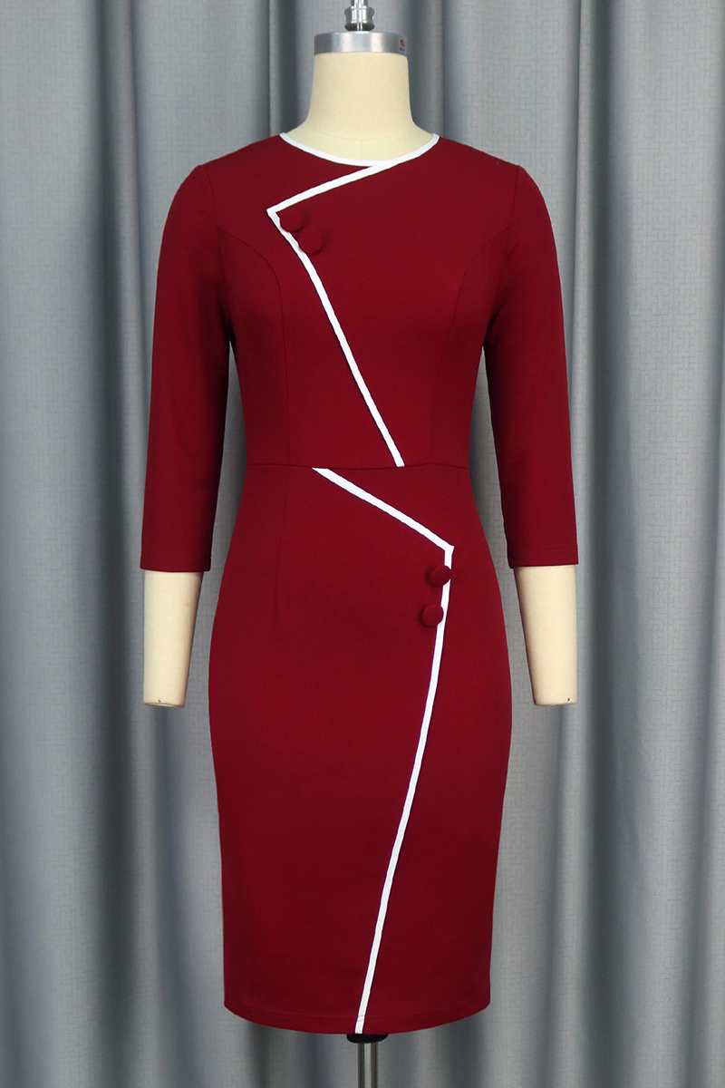 Burgundy Elegant Buttons Contrast O Neck Wrapped Skirt Dresses