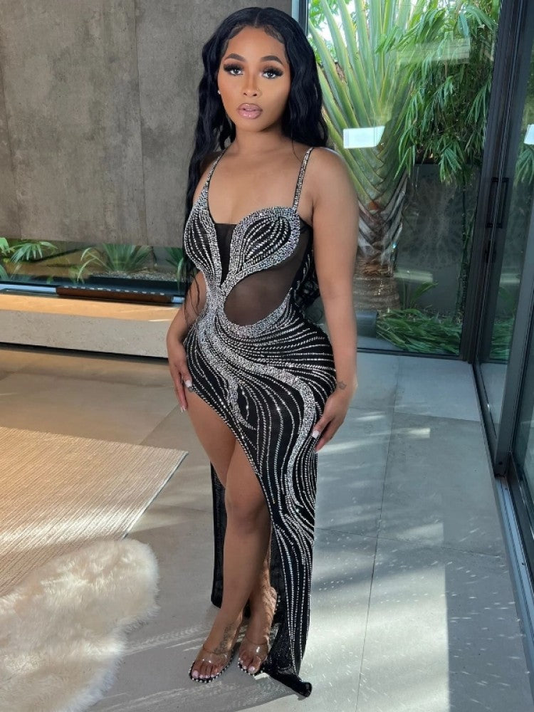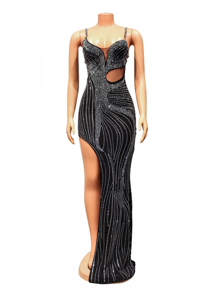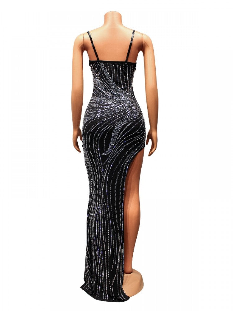 Sexy Black Hot Drilling Split Hem Sleeveless Dress