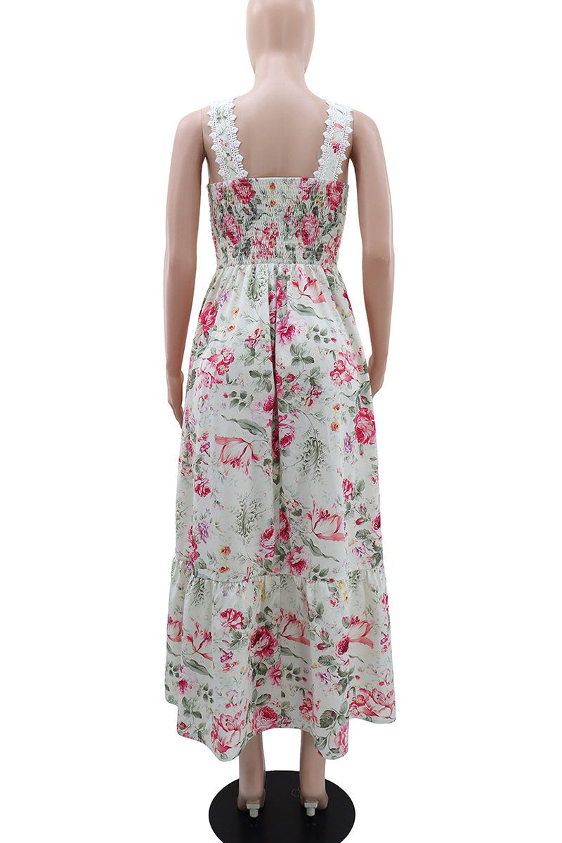White Elegant Print Backless Spaghetti Strap Long Dresses