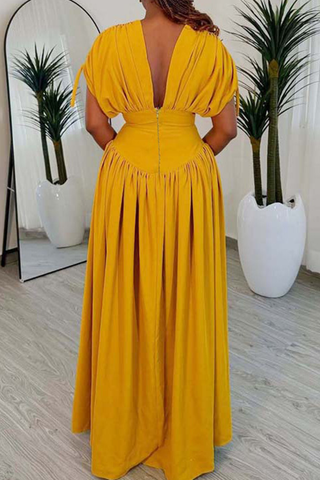 Yellow Elegant Solid Color Draw String V Neck Long Dresses
