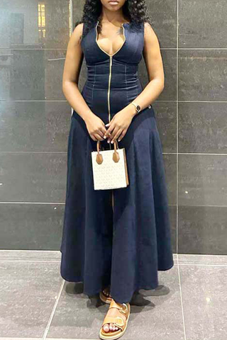 Navy Blue Casual Solid Color Pocket Zipper Zipper Collar Long Dresses