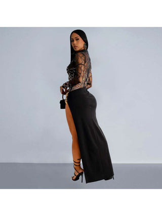 Spider Rhinestones Split Hem Sheer Maxi Dress