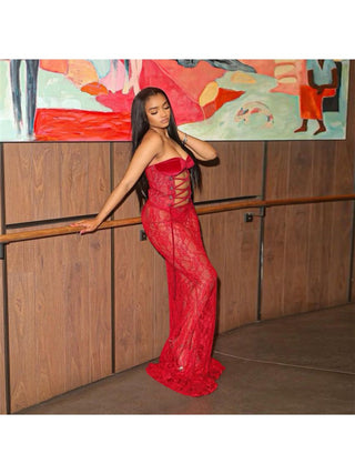 Lace Sheer Tie-wrap Strapless Maxi Dress