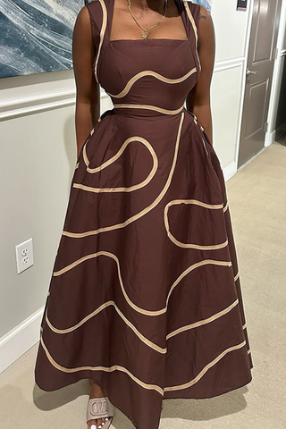 Dark Brown Casual Print Pocket Square Neck Long Dresses