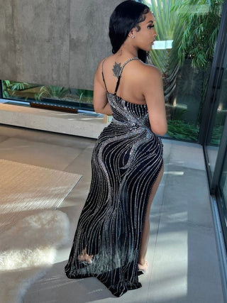 Sexy Black Hot Drilling Split Hem Sleeveless Dress