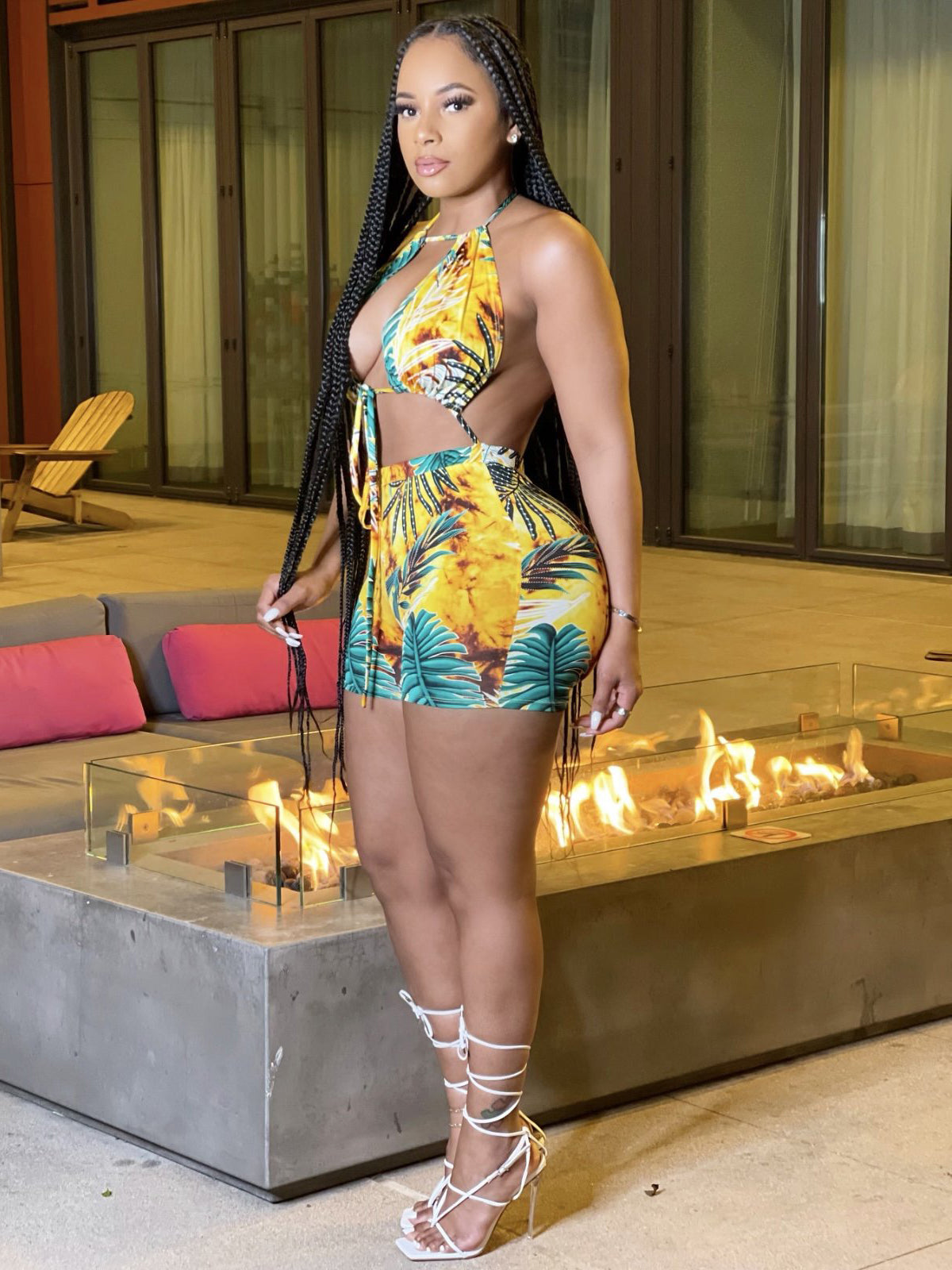 Alluring Leaf Print Tie-Wrap Halter Romper