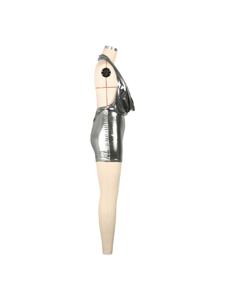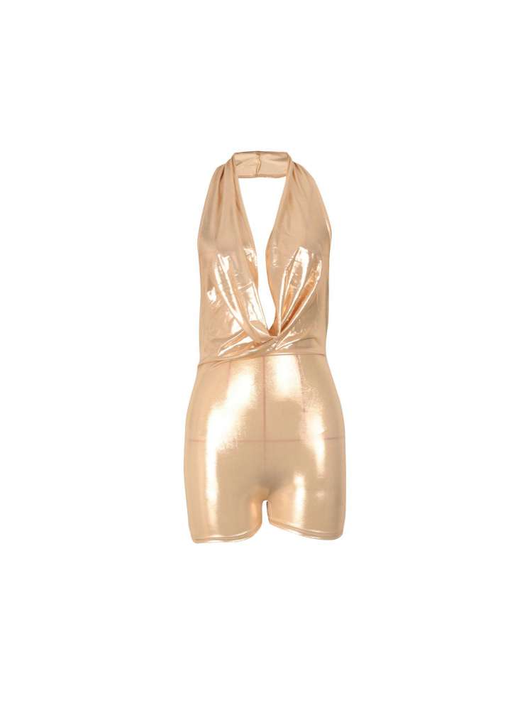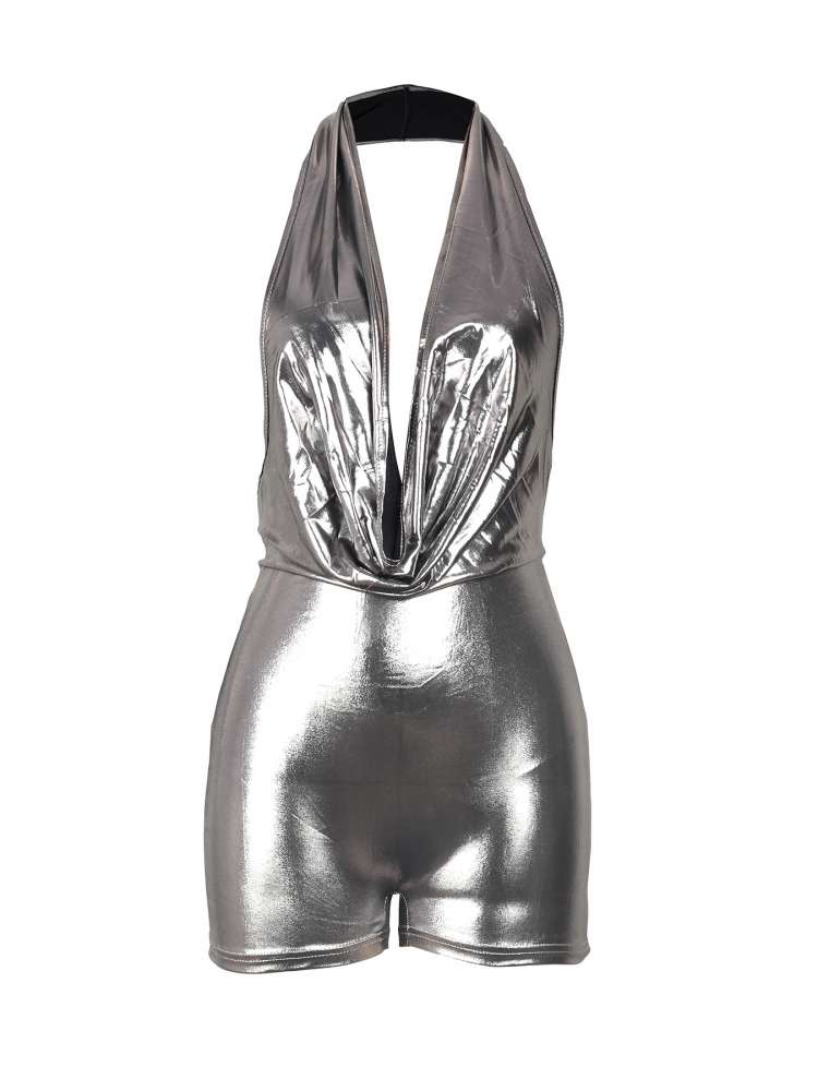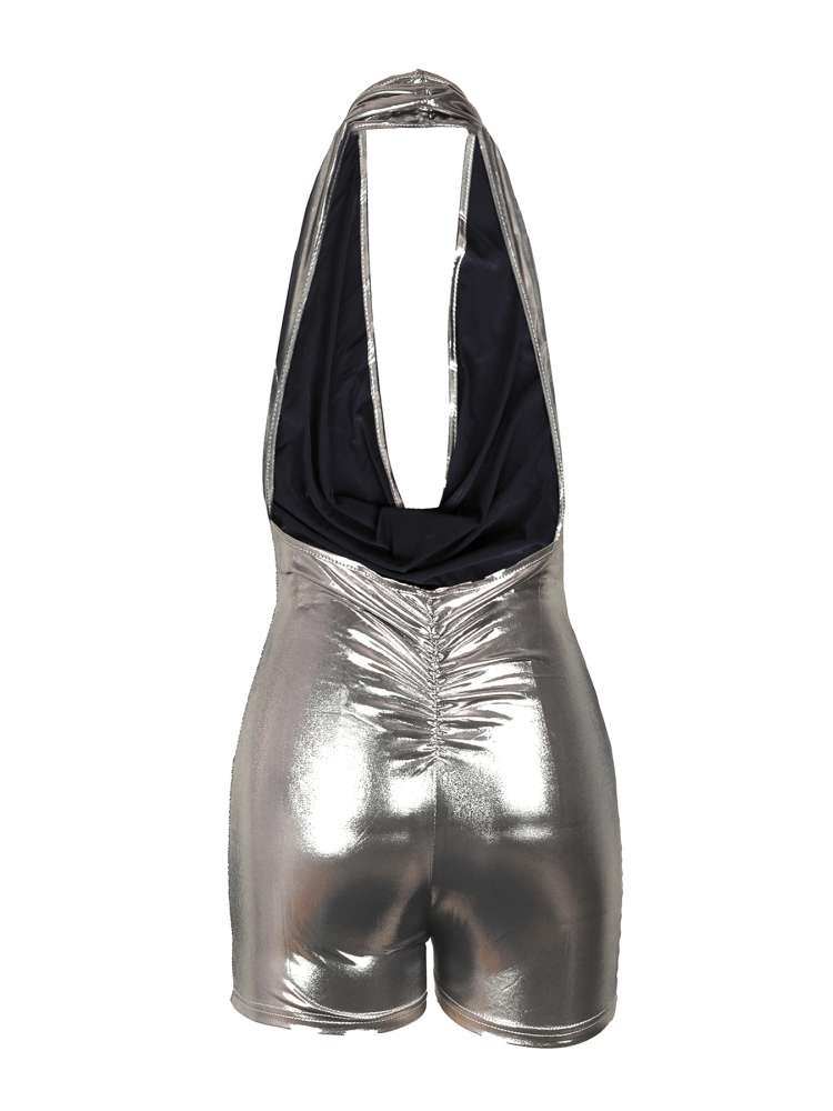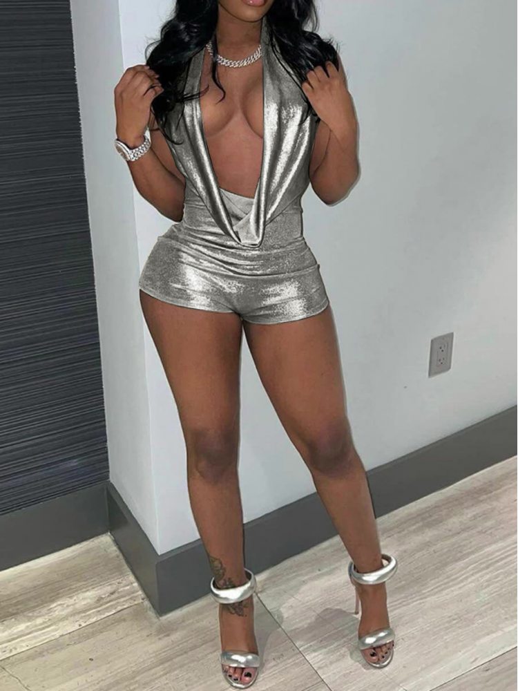 The Metallic Ruched Deep V Neck Backless Rompers is designed to radiate energy with its casual yet sexy style, making it a versatile addition to any wardrobe. Made from 85% high-quality Terylene, Polyester, Spandex, this romper is soft, elastic, and skin-friendly, ensuring unmatched comfort for all-day wear. Available in Black, Champagne, Silver and adorned with stylish Halter, Metallic, Patchwork, its simple yet chic design makes it perfect for everyday wear, casual outings, workouts, club attire, or outdoor activities.