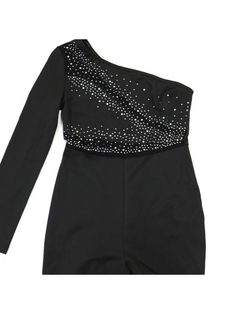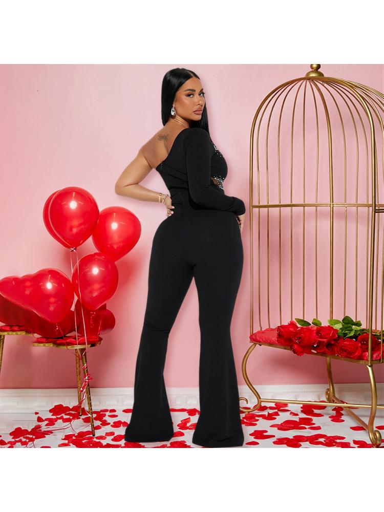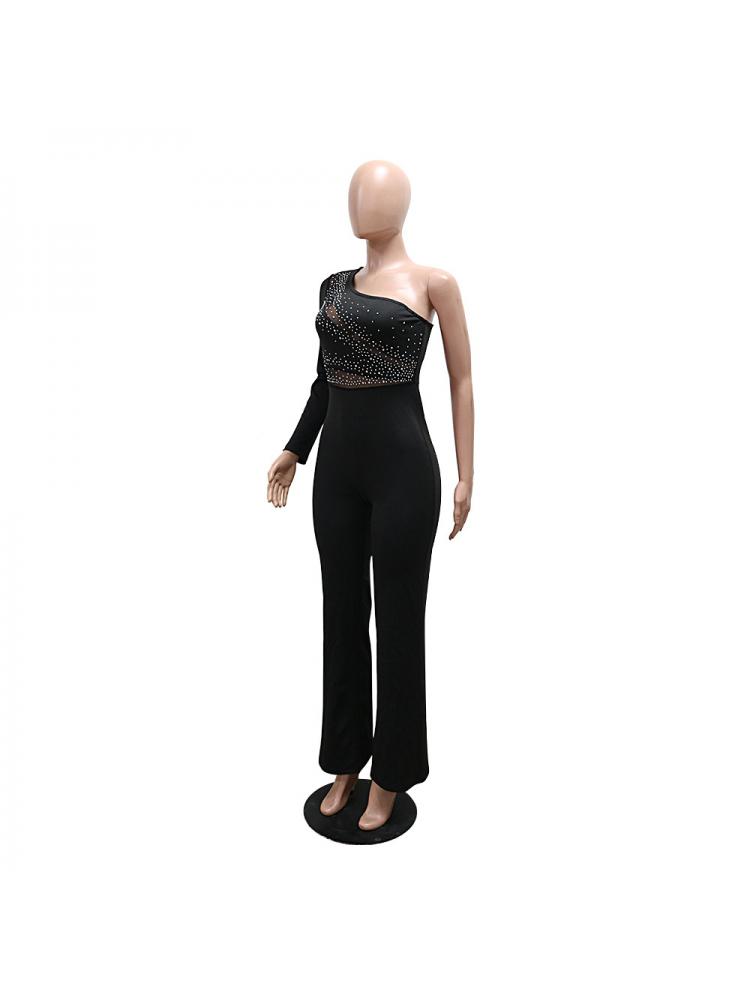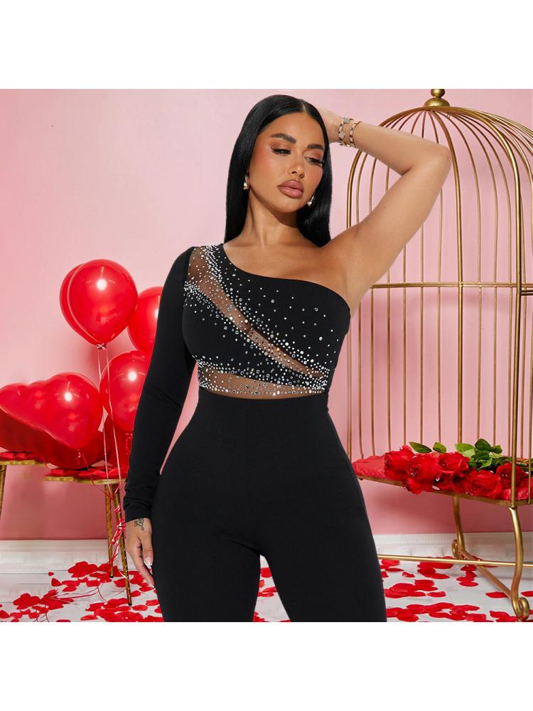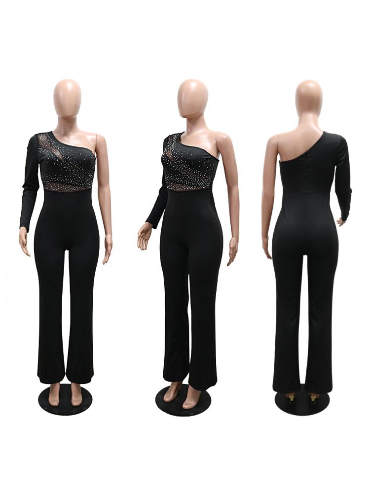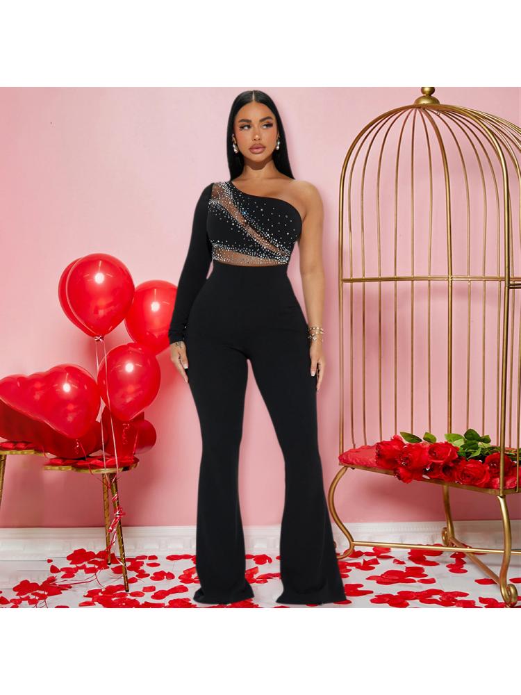 Rhinestones Sheer One Shoulder Flared Jumpsuits