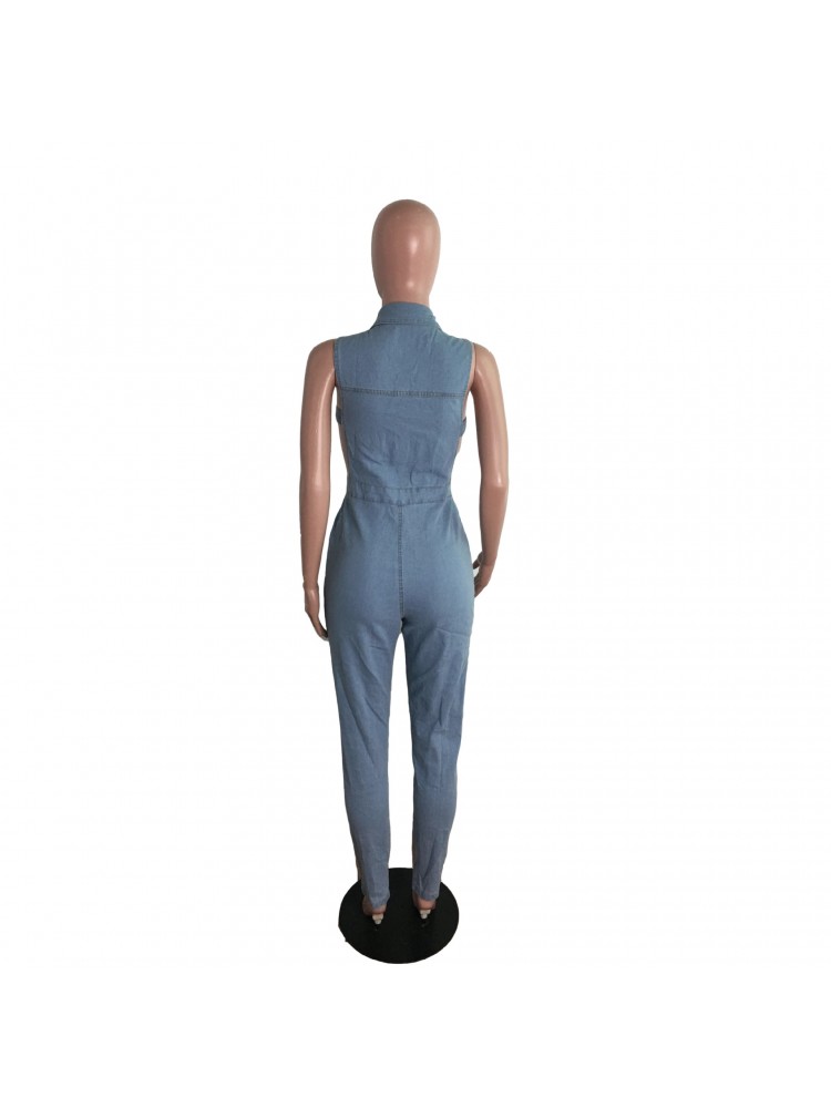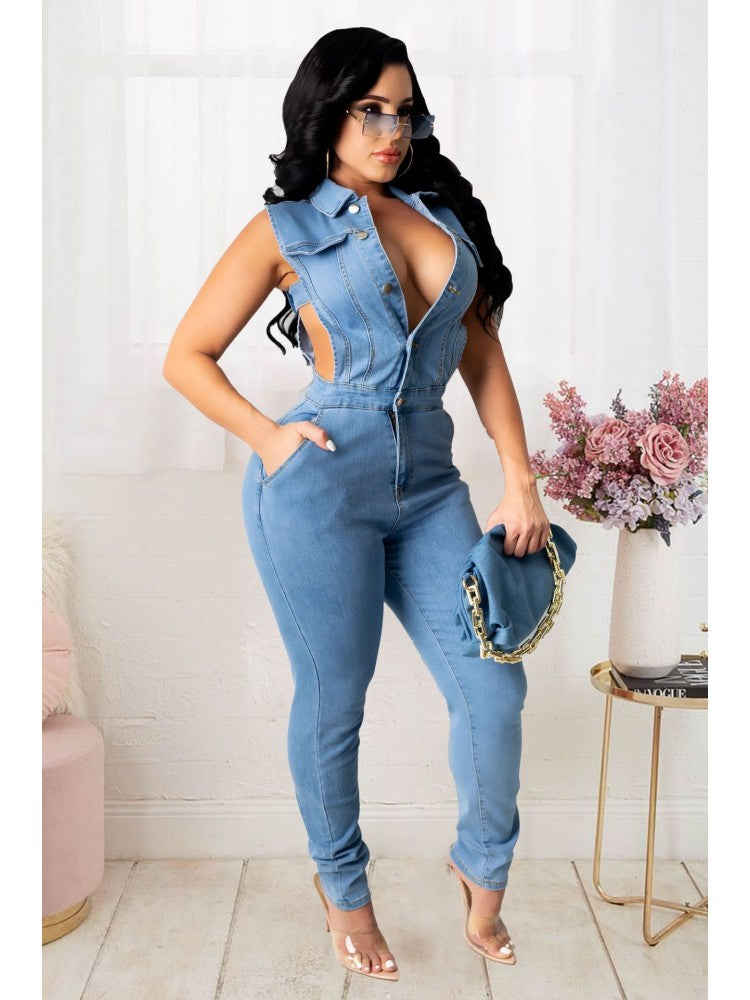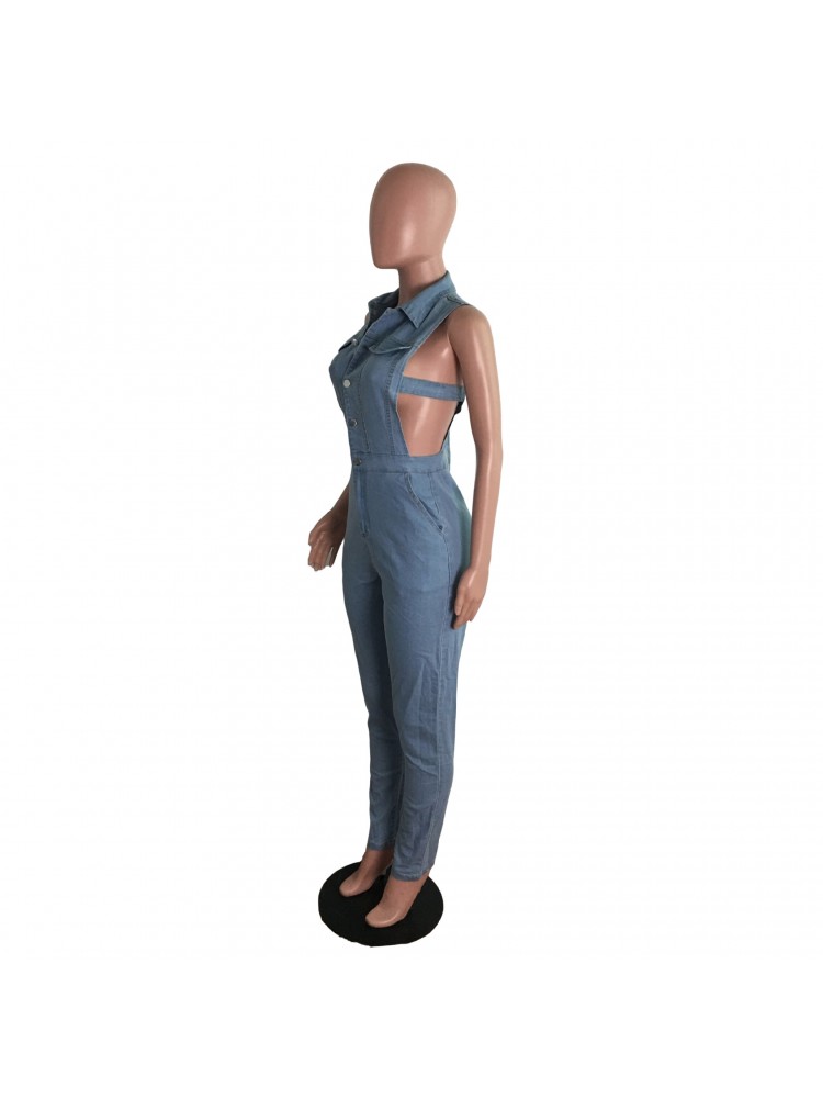 Waist Cut Sleeveless Collar Denim Jumpsuit