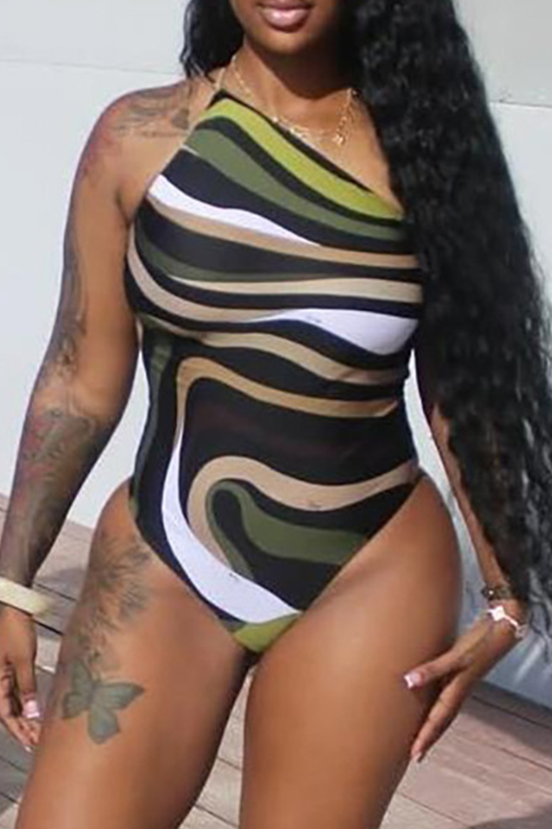 Green Sexy Print Patchwork Spaghetti Strap Skinny Bodysuits