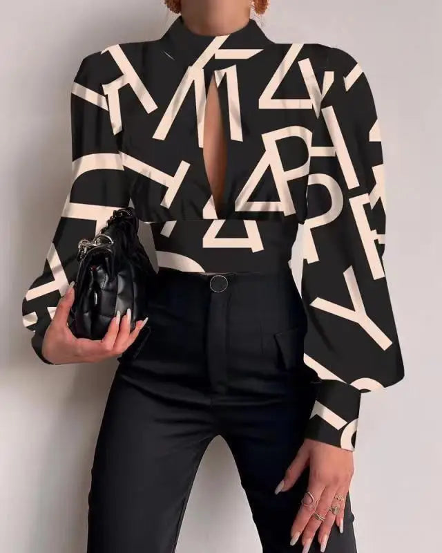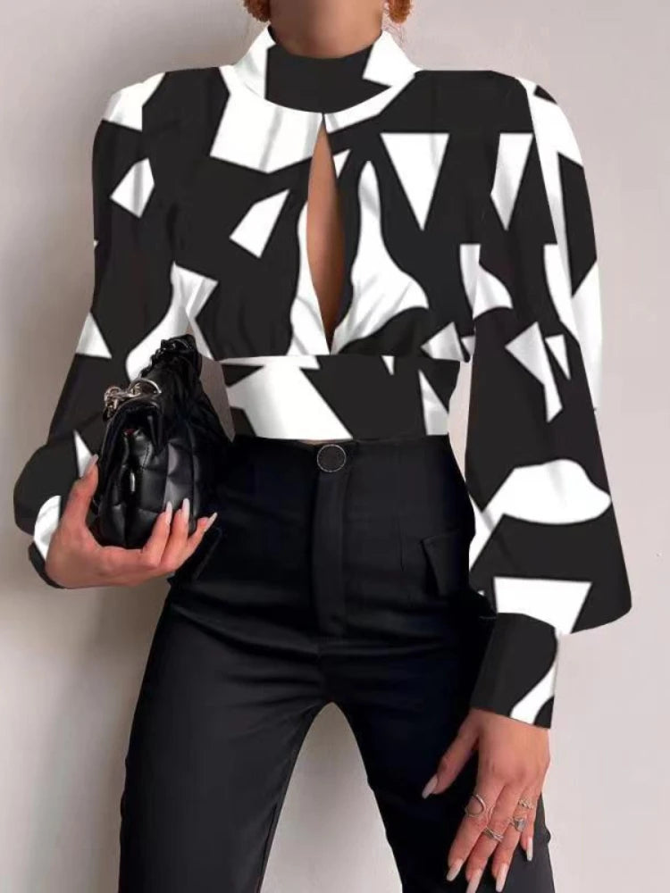 New In Standing Collar Long Sleeve Lantern Tops Sleeve Backless Hollow Blouse Women Female Clothing Elegant Shirts and Blouses