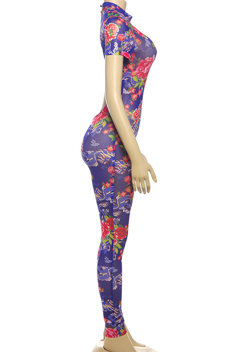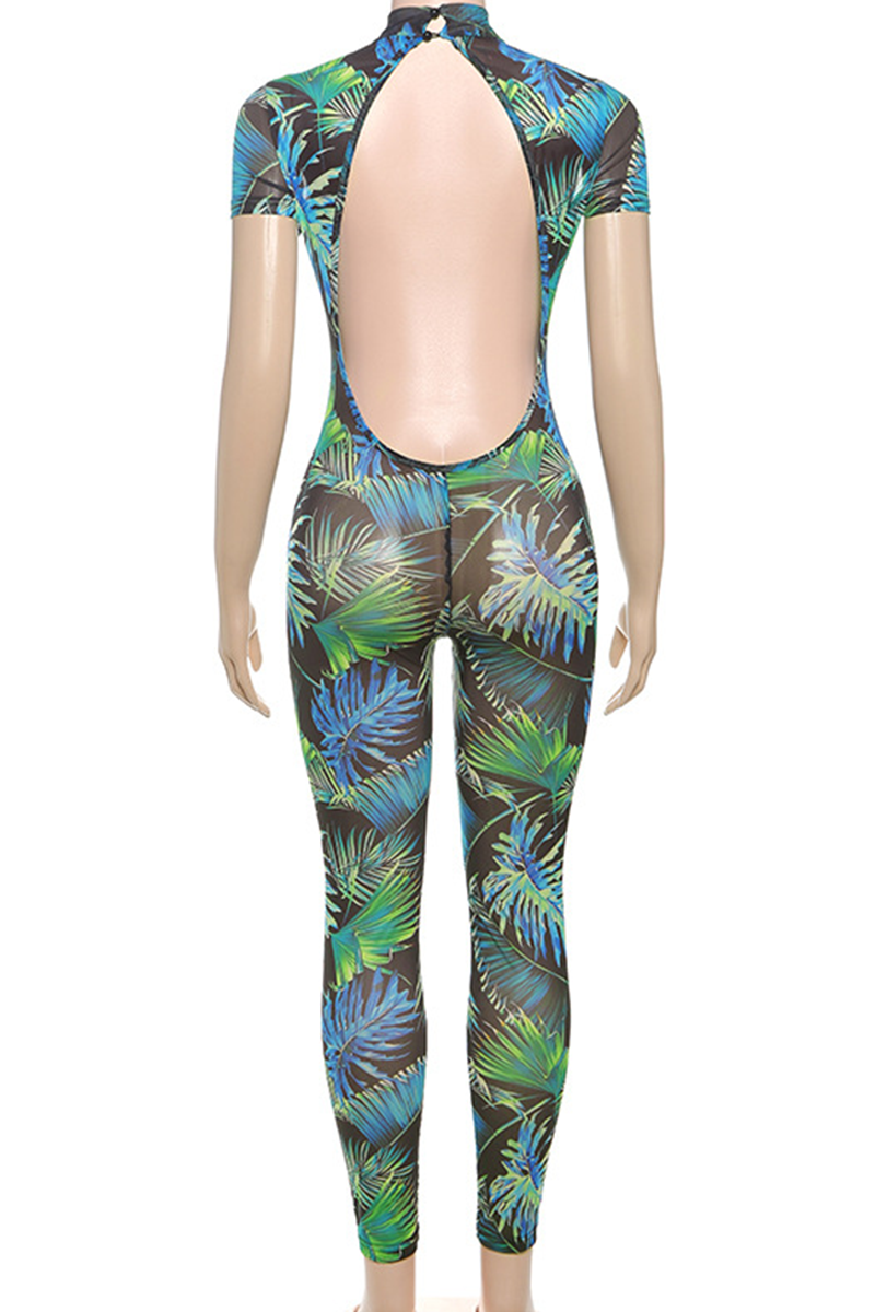 Purple Sexy Print Backless O Neck Skinny Jumpsuits