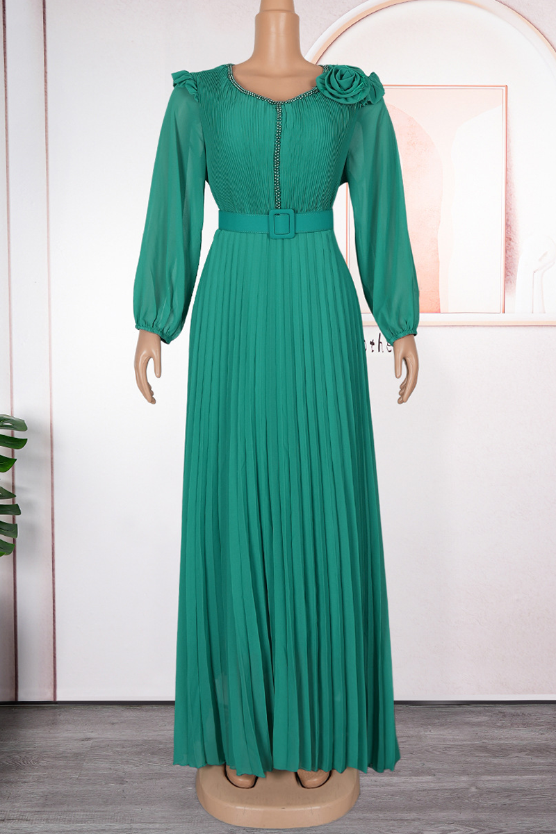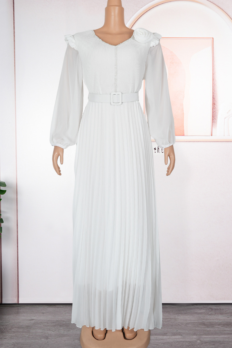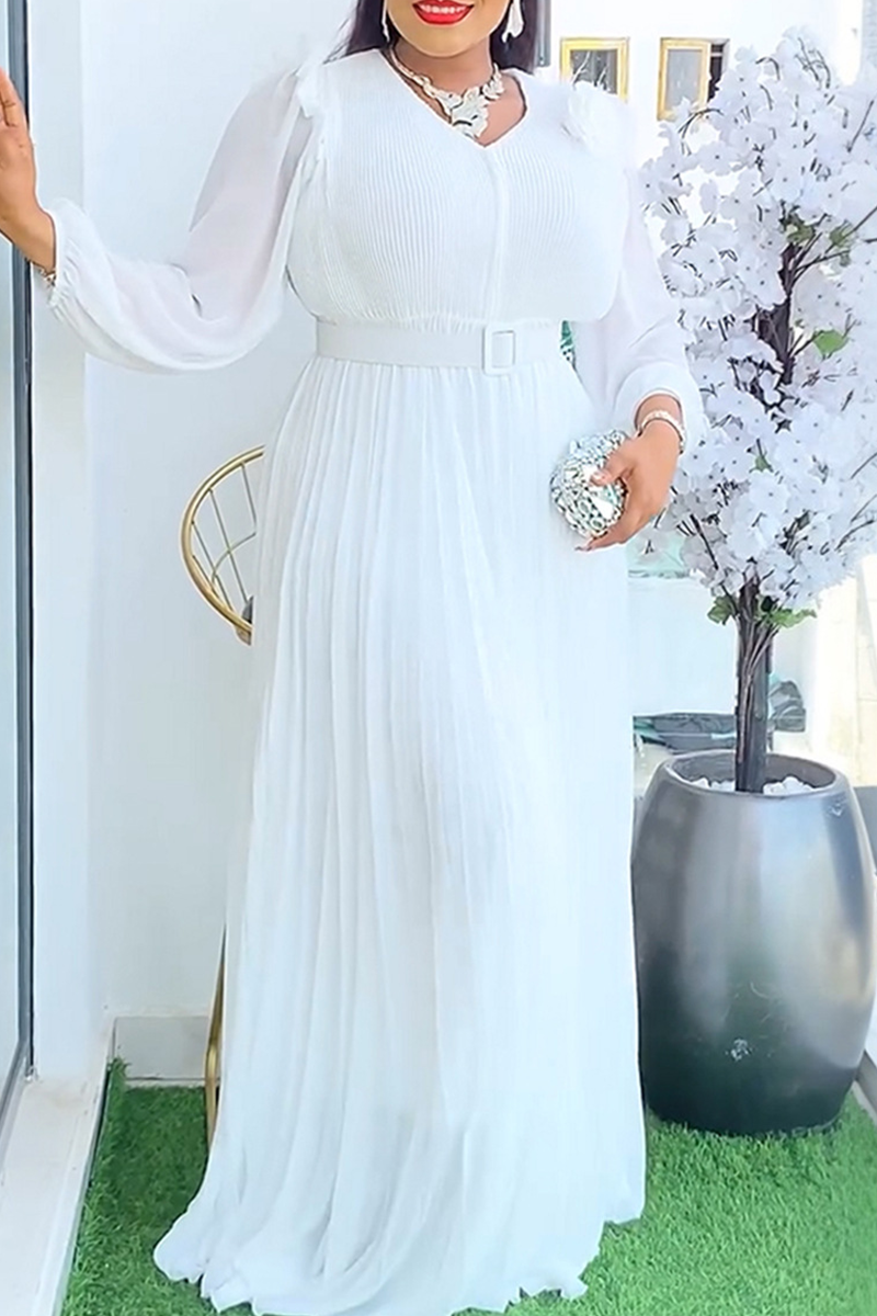 White Elegant Solid Color With Belt Pleated V Neck Long Plus Size Dresses